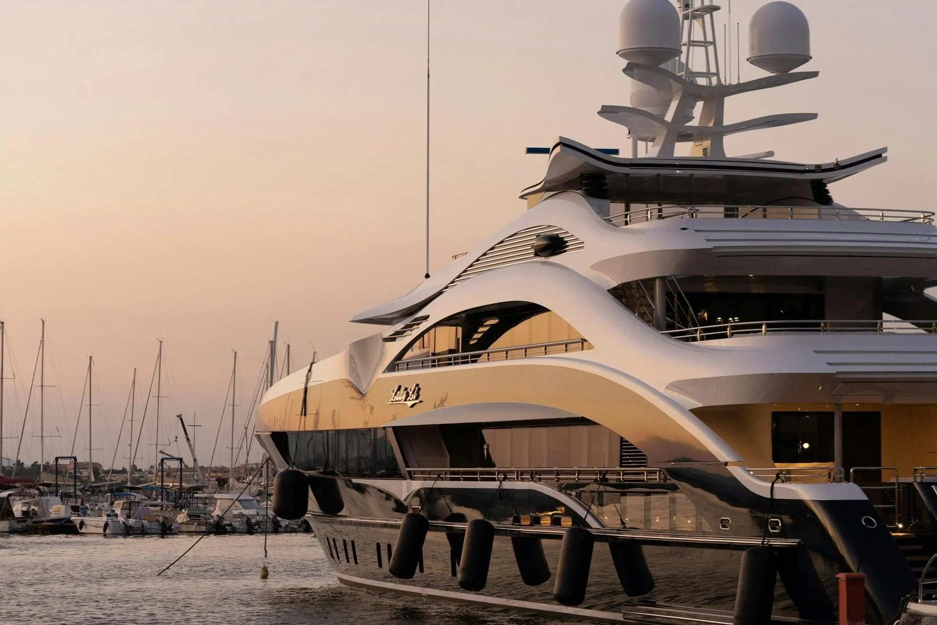 Super yacht in water during sunset